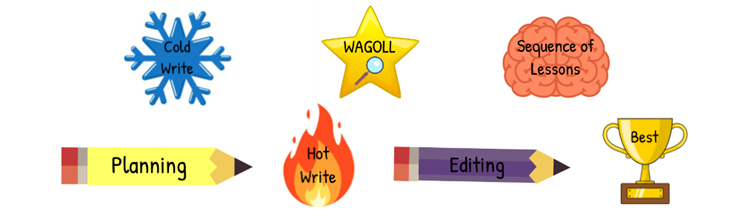 Our writing process begins with an independent cold write which is used to inform teachers’ planning and provide a baseline of what the children already know about a particular genre and what features require further development. The main part of the unit starts by identifying the purpose and audience for writing as well as exploring a WAGOLL (What A Good One Looks Like). A WAGOLL is used to model a high-quality example of writing from the focus genre and it allows children to identify the features they will need to use in their independent writing. After this, the main sequence of lessons begins where the features identified from the cold write are taught and the children have opportunities to apply their knowledge after seeing high-quality examples modelled. In addition to writing lessons, stand-alone grammar lessons are taught weekly. The aim of these lessons are to pre-teach grammar features for writing lessons and address misconceptions of concepts and grammar features that have already been taught.